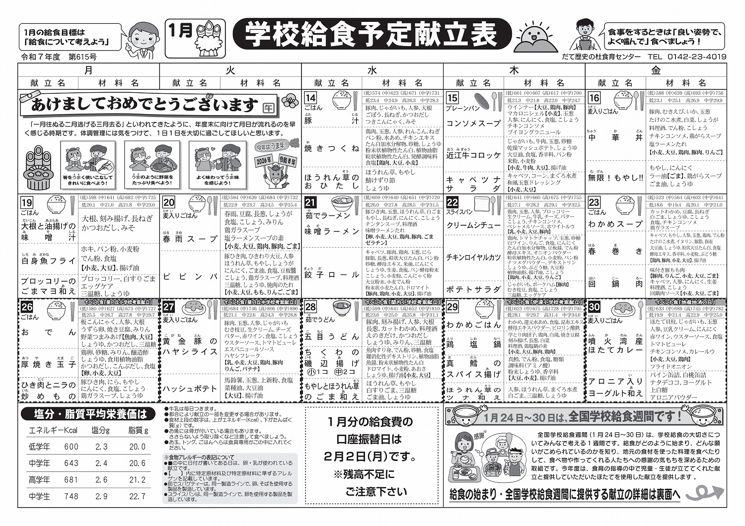 令和8年1月の献立表